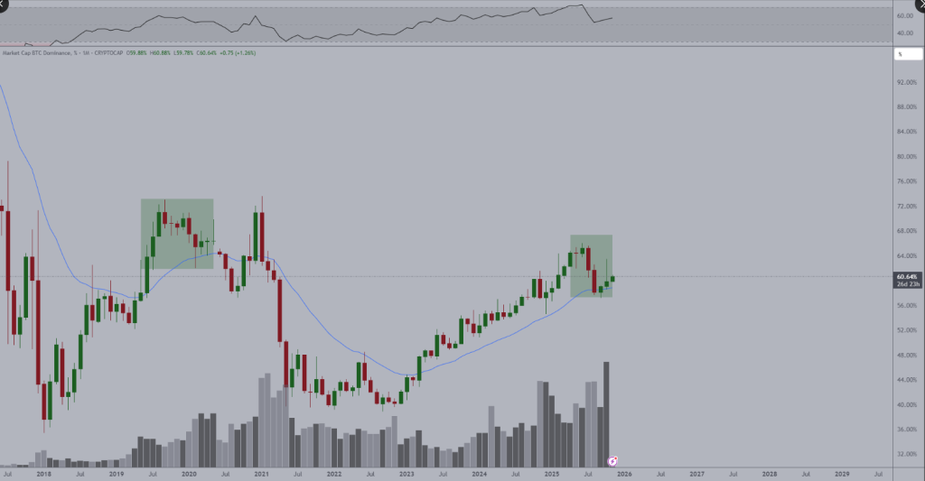 Bitcoin dominance sits at 60% and has been testing a vital long-run support line. According to market
