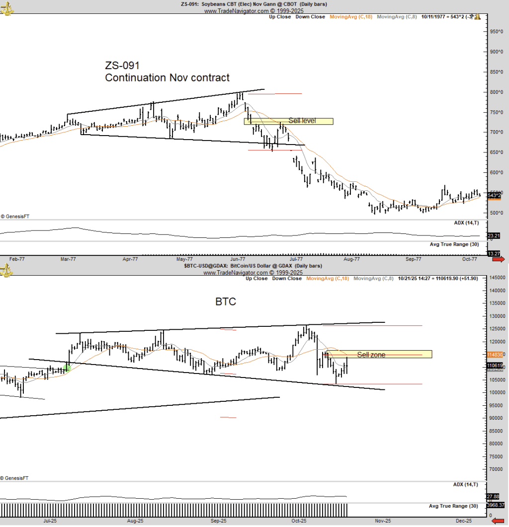 Veteran chartist Peter Brandt ignited a fresh technical debate on X after publishing two annotated charts—one of today’s Bitcoin daily bars, the other of Chicago Board of Trade soybeans from 1977—arguing that the cryptocurrency may be carving out a broadening top akin to the historical commodity pattern that preceded a 50% collapse.