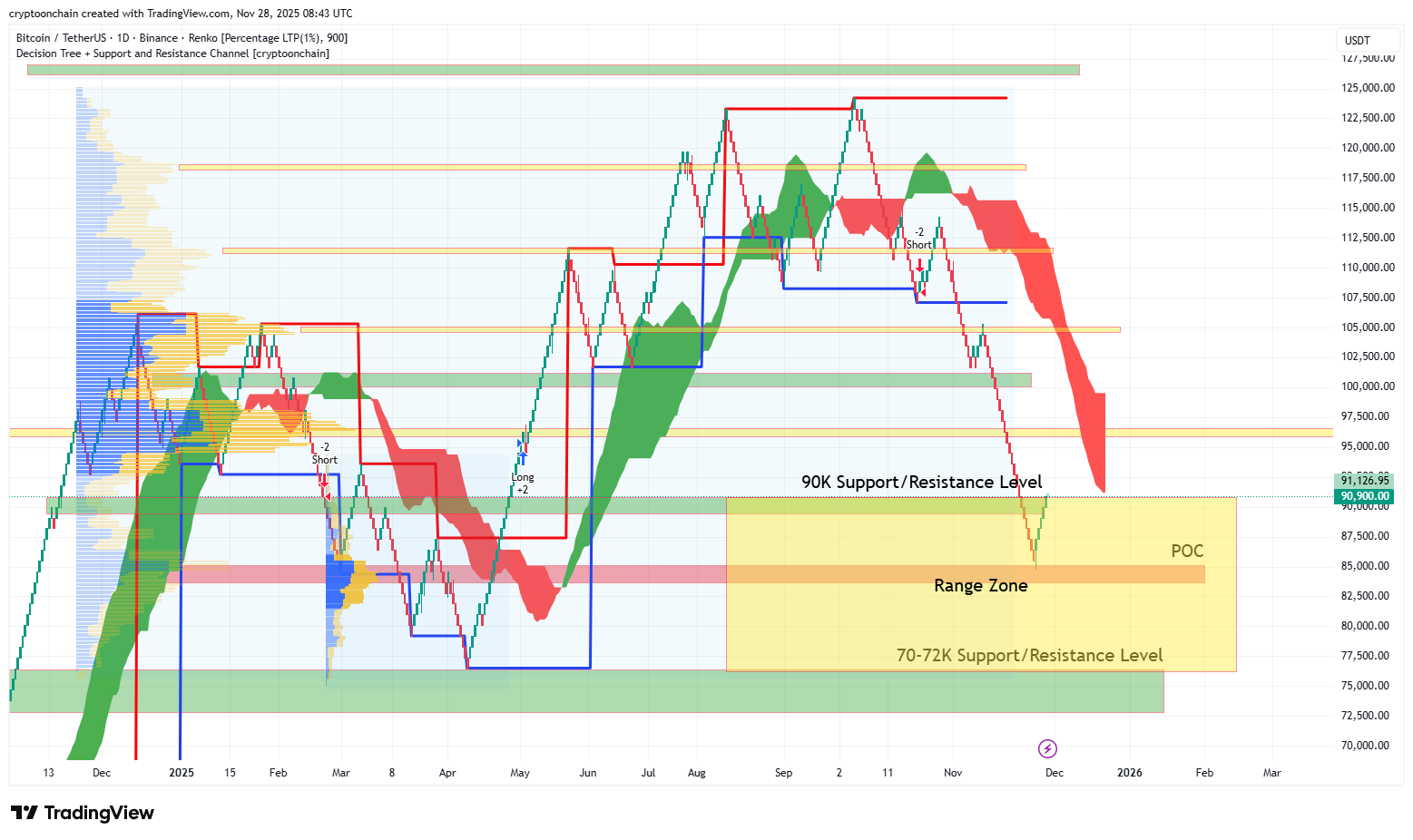 After bouncing from the POC around $82,000, CryptoOnchain said the flagship cryptocurrency has now settled into a “clear” consolidation zone between the $70,000 and $90,000 region. While the Bitcoin price currently sits above $90,000, the analyst noted that the market leader faces potential rejection.