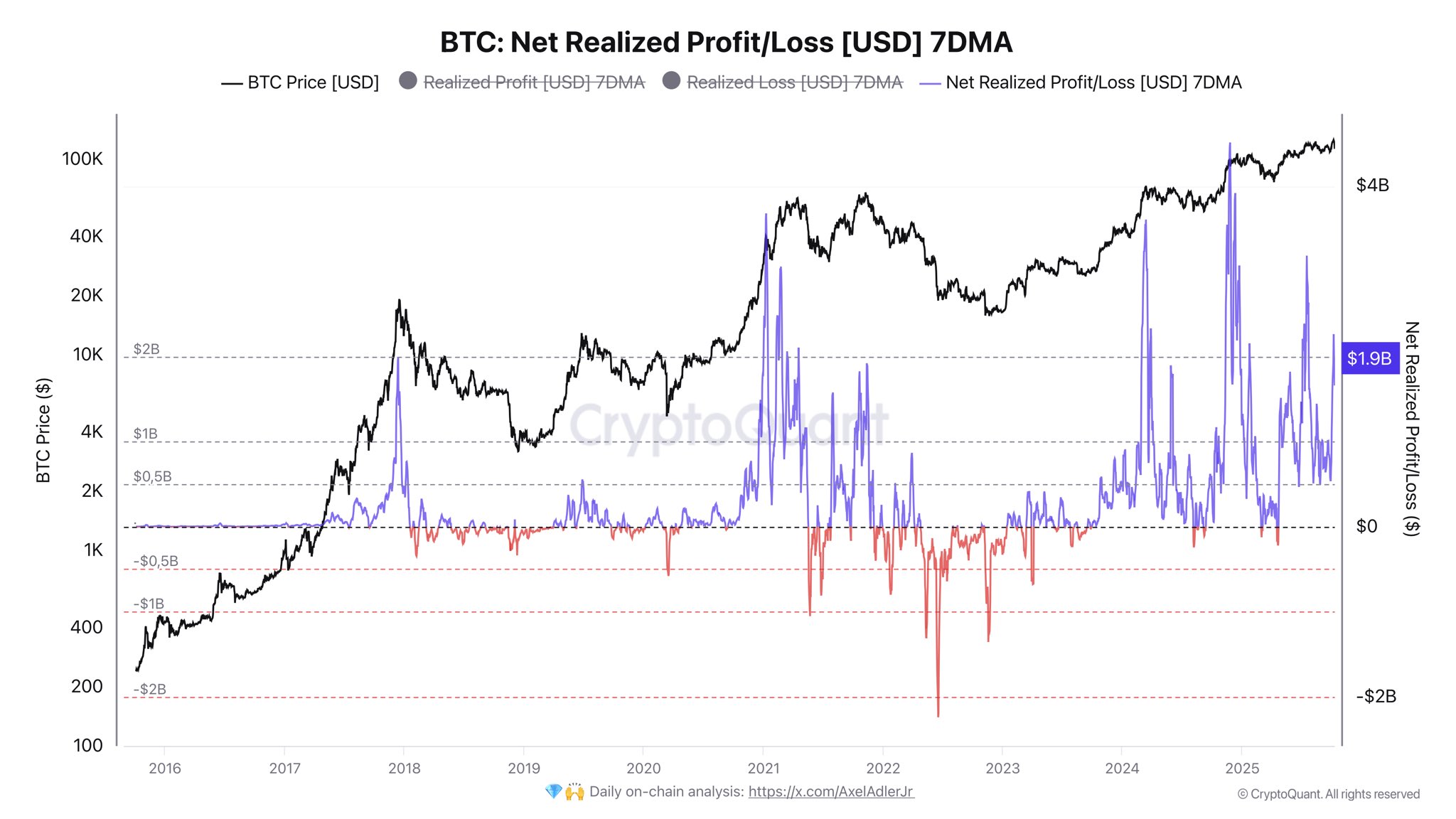 The analyst put it out that the 7-day moving average of the Net Realized Profit/Loss metric recently reached a peak of $2.25 billion, the fourth-highest level seen in the current market cycle. Meanwhile, the metric’s weekly average holds well above $1.6 billion, indicating that profit-taking is still at a high level.