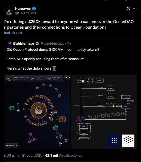 On Tuesday, Humayun Sheikh, CEO of Fetch.AI, offered a bounty $250,000 to anyone who could “uncover the OceanDAO signatories and their connections to Ocean Foundation.” The post followed last week’s allegations that Ocean Protocol had dumped hundreds of millions of FET tokens into crypto exchanges earlier this year.
