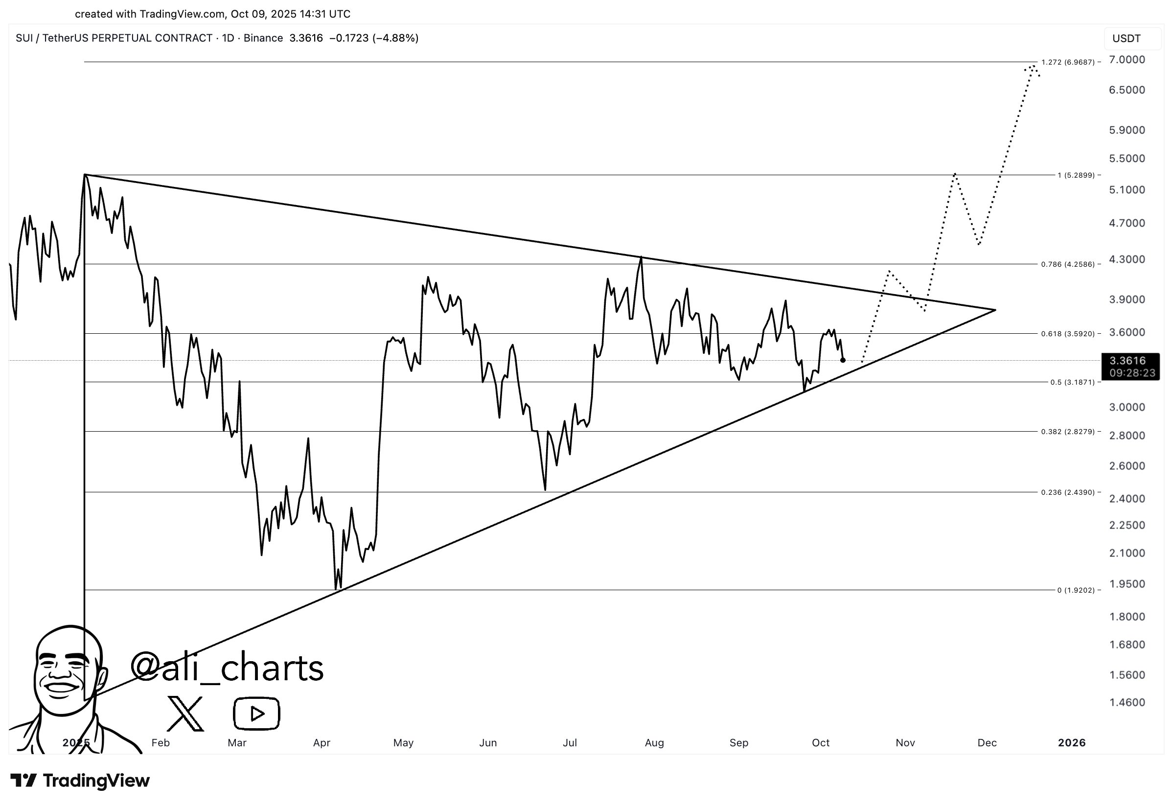 Based on Martinez’s analysis, SUI is forming a symmetrical triangle pattern that has been developing since early 2025. This structure is typically characterized by converging trendlines, representing lower highs and higher lows, which reflect a period of declining volatility preceding a decisive price move.