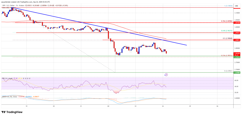 XRP price started a fresh decline below the $2.90 zone. The price is now showing bearish signs and might decline again below the $2.780 zone.